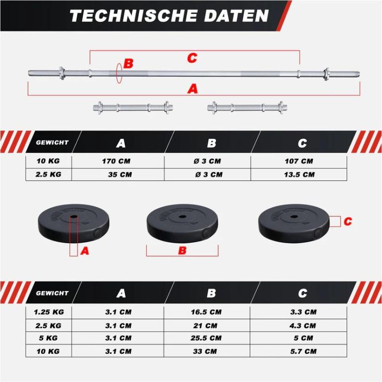 1× súlyzórúd: 170 cm, 10 kg, teherbírás 200 kg, ⌀ 30/31 mm