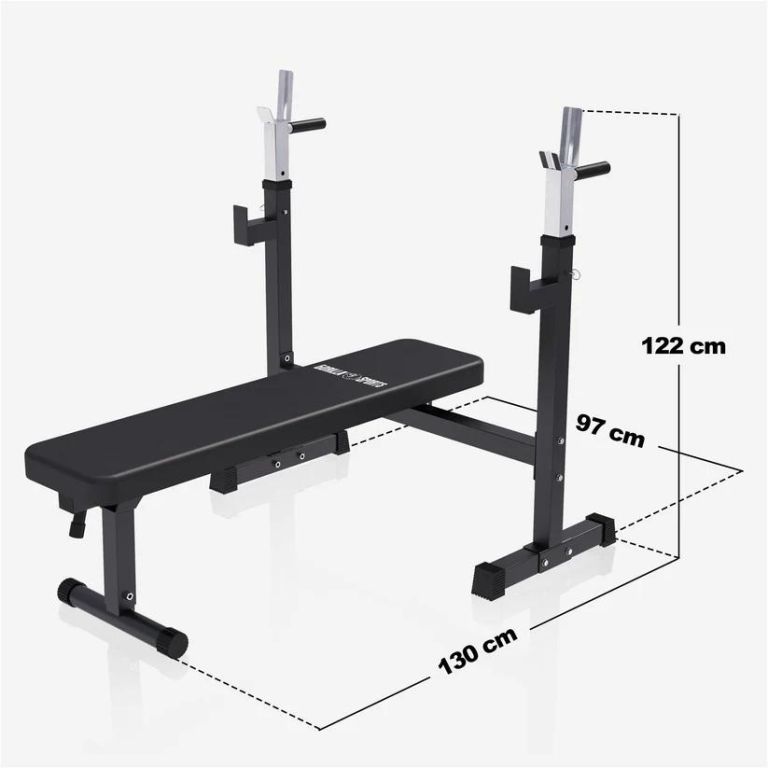 Tárolható pad 300 kg teherbírással, hosszú és rövid tengellyel és súlyokkal együtt.