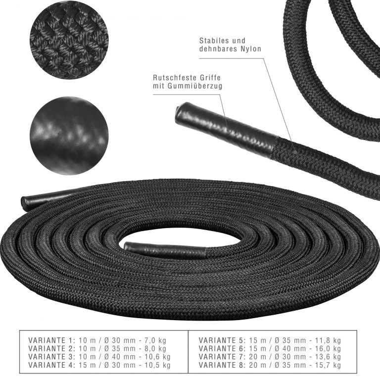 Edzés hatékonyan 15 méter hosszú harci kötéllel. Teljes testmozgás szórakozással és sokoldalúsággal. Számos lehetőséget kínál az erő növelésére.