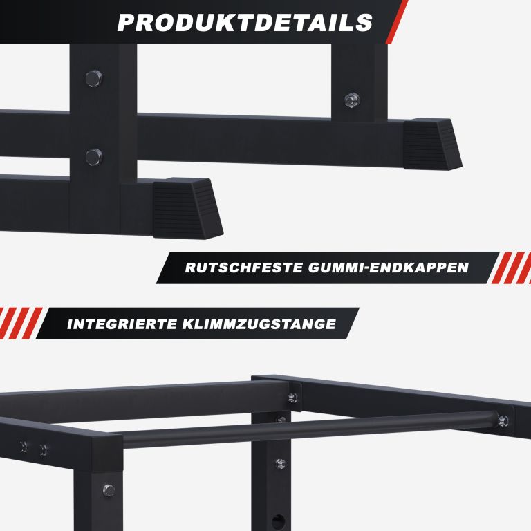A stabil acélszerkezet csúszásgátló végekkel védi a padlót és biztonságot nyújt még nagyobb terhelések esetén is. A Power Rack könnyen kombinálható paddal, tengellyel és tárcsákkal, így egy komplett edzőállomást állíthat össze. Az egyszerű összeszerelés és az intelligens kialakítás lehetővé teszi a gyors kezdést felesleges bonyodalmak nélkül.