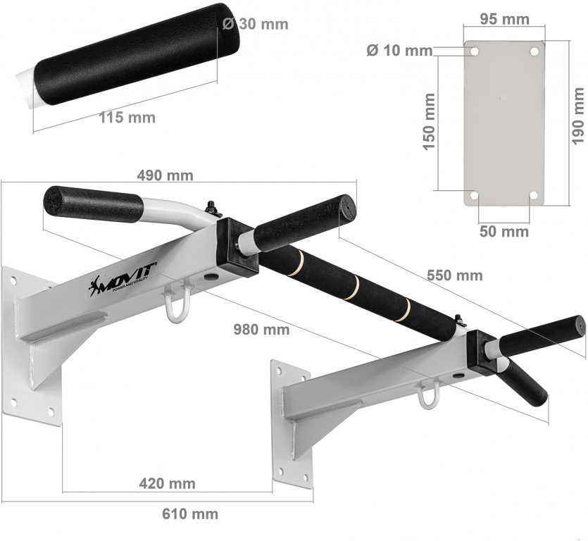 A MOVIT Profi falra szerelhető súlyzóval különféle gyakorlatokat végezhet, amelyek erősítik a kar, váll, has és hát izmait. A rendkívül stabil, hegesztett sarkú, négyszögletes acélszerkezet biztonságosan rögzíthető a falhoz 8 db, 8.8-as szilárdsági osztályú, jó minőségű hatlapfejű csavarral (60 x 12 mm) és megfelelő tiplivel (a szállítási terjedelemben), így max. 350 kg-ig. A mellékelt rögzítőanyag segítségével a fali rúd azonnal a falra rögzíthető és kezdődhet az edzés. A beépítés csak megfelelő falra (pl. betonba vagy kőbe) megengedett, amely megfelel a megfelelő súlyterhelésnek (nem alkalmas gipszkarton falakra, üreges válaszfalakra vagy vakolatba). 3 markolat a biztonságos és hólyagmentes edzéshez 2 pár fogantyú (széles felső fogantyú és kalapács) és további habpárnázás a rúdon (szilárd felső és alsó fogantyúk).