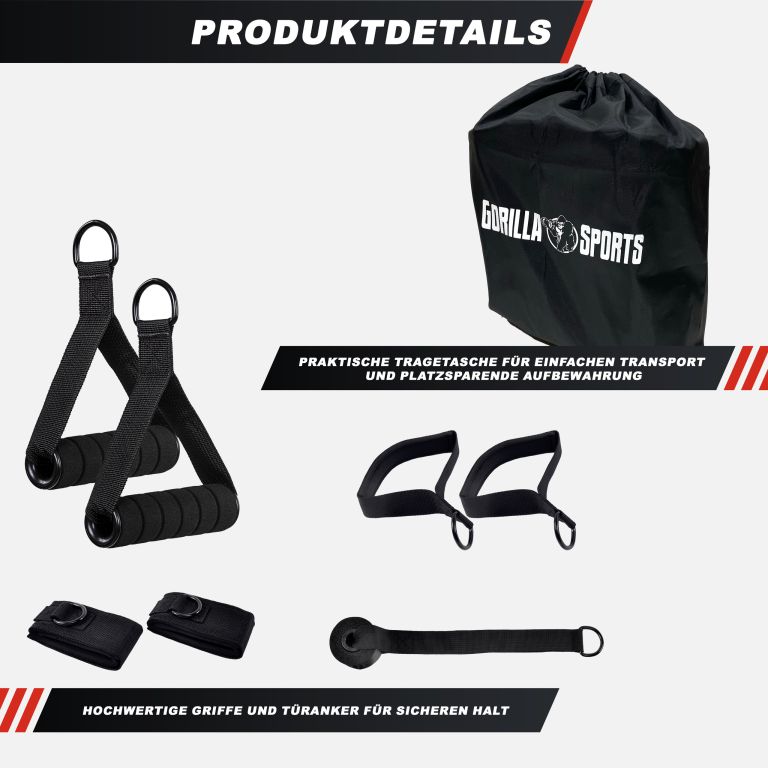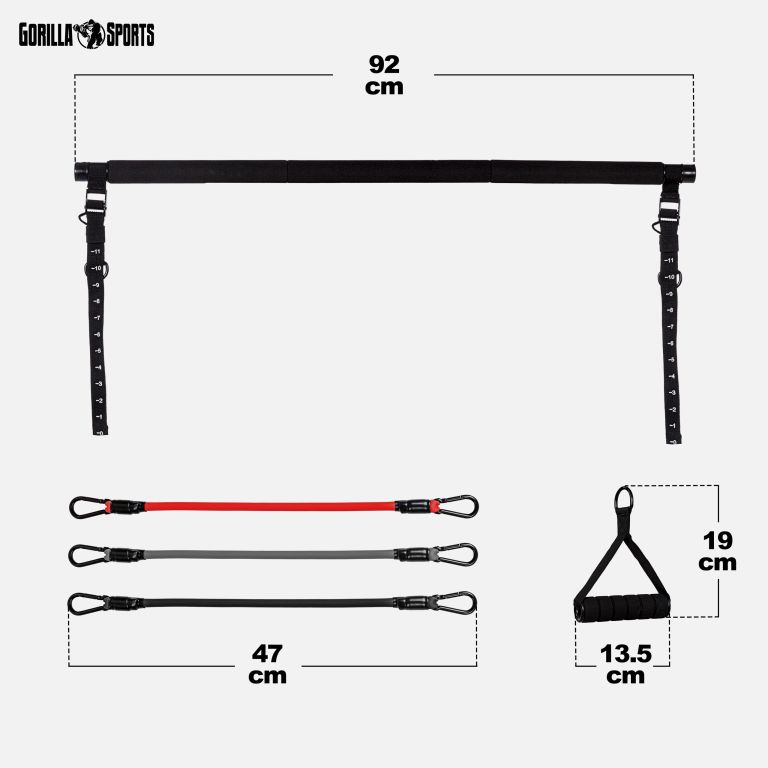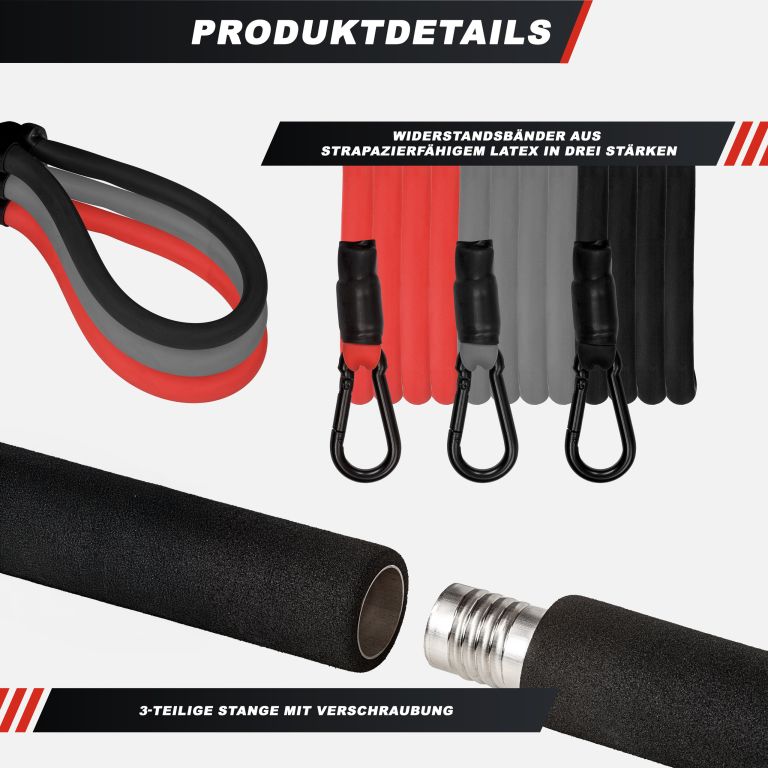 Az állítható rudak (90–100 cm) és háromféle ellenállású szalag (13, 18, 23 kg) révén a szett minden edzettségi szinthez igazítható. Masszív acél és EVA hab biztosítja a tartósságot, míg a praktikus hordtáska megkönnyíti a szállítást és tárolást. Az összeszerelés egyszerű, a tisztítás gyors, így az edzés mindig kéznél van.