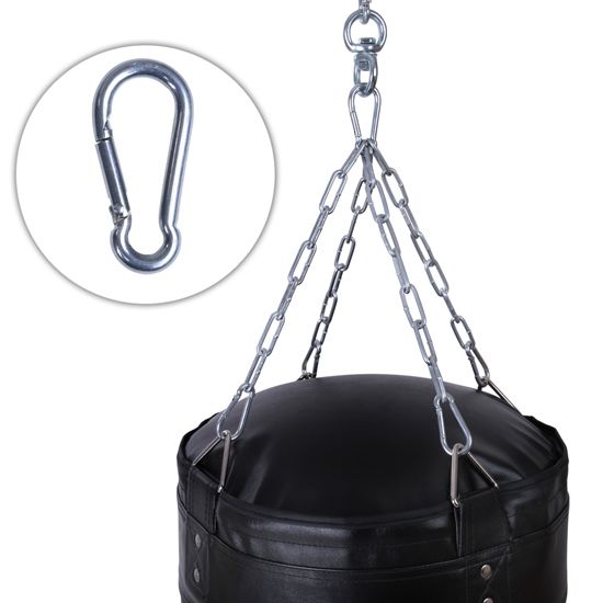 A rögzített négypontos acélláncot karabinerrel egy forgócsukló köti össze. Ennek köszönhetően nem csavarodhat és nem gubancolódhat. A keresztvarrással ellátott szakadásálló zsanéroknak köszönhetően a boxzsák rendkívül tartós kiegészítő, amely alkalmas bokszoláshoz, fitneszhez, stressz elleni küzdősportokhoz vagy egyszerűen csak az edzés feldobásához.