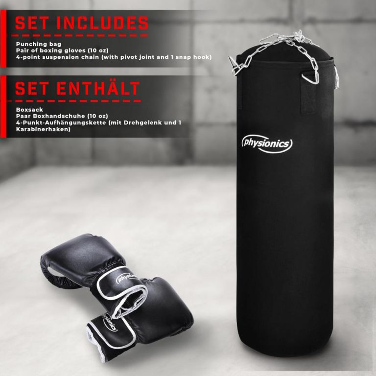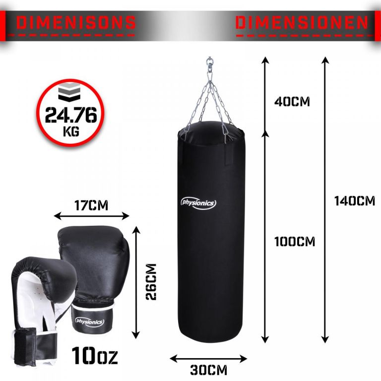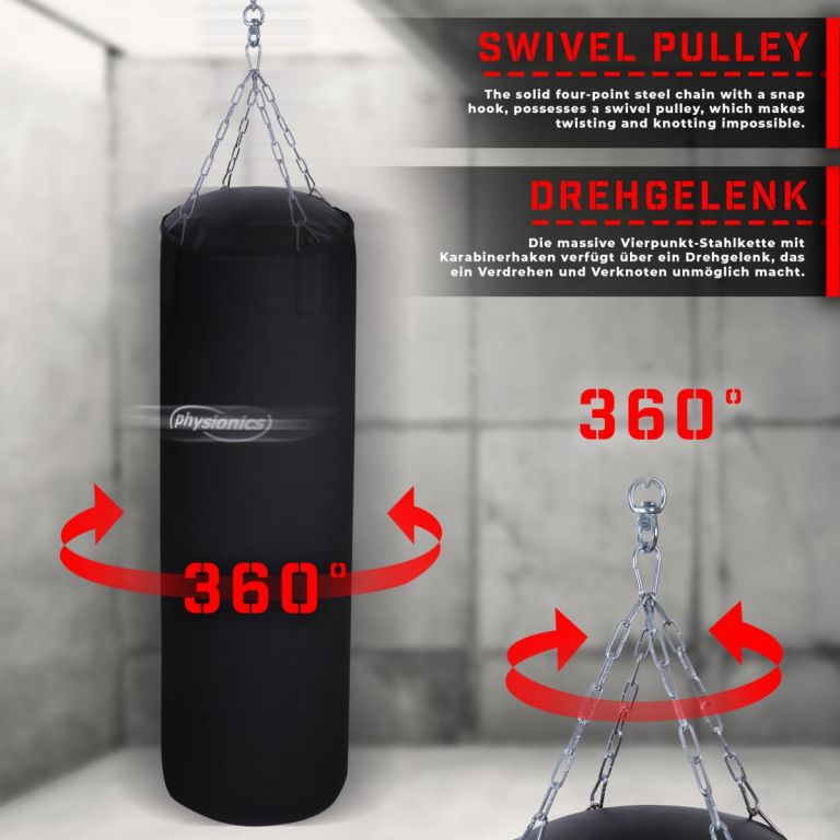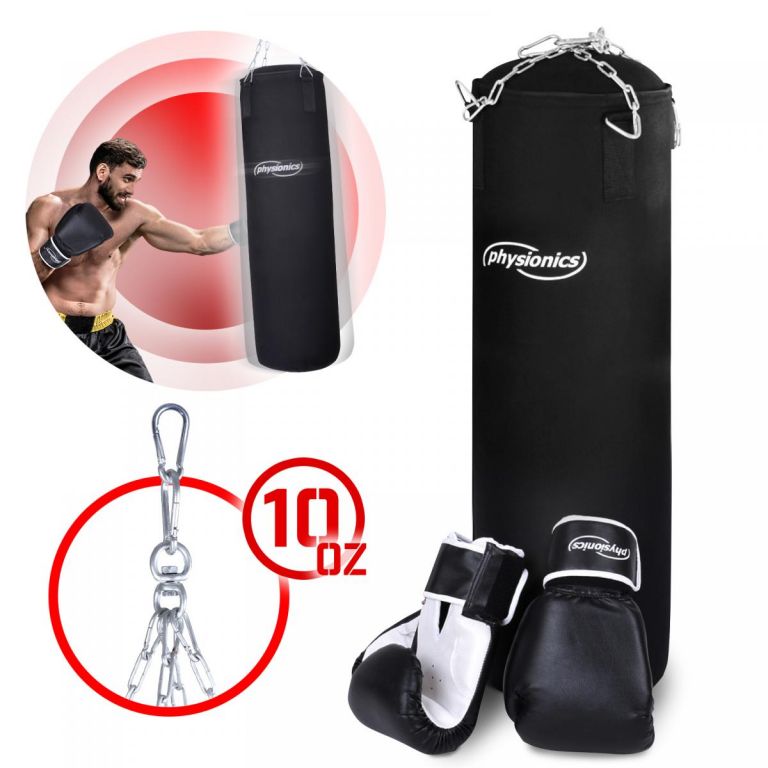 100 cm-es magasságával és 30 cm-es átmérőjével új boxzsákja nagyszerű fitneszkiegészítő. A csomag tartalmaz egy erős, négypontos acél láncpántot karabinerrel és forgócsuklóval, így a bokszzsák egy pillanat alatt felszerelhető a mennyezetre. A forgócsuklónak köszönhetően itt semmi sem gabalyodik össze, amikor lendítés után lendíted a boxzsákot, és lassan izzadni kezdesz. A keresztvarrással ellátott szakadásálló zsanérok rendkívül tartós kiegészítővé teszik a boxzsákot.