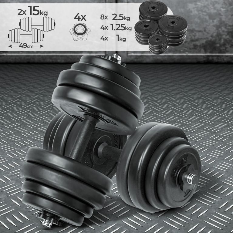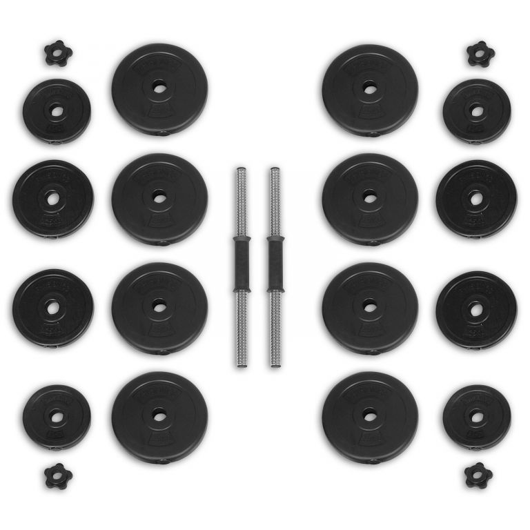 Egykezes súlyzóink nagyon sokoldalúak. Nem csak bicepsz és tricepsz edzésére, hanem például hát- és hasizmokra is. A készlet két ergonomikusan kialakított súlyzórudat és 16 súlyzót tartalmaz.