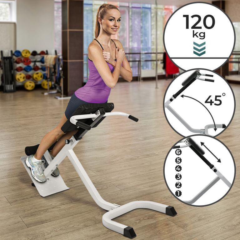 Összecsukható háttrénerünk lehetővé teszi, hogy anélkül edzeni a hátát, hogy fizetne az edzőteremért. Összecsukható, 6 magasságállítási pozícióval rendelkezik, porszórt kivitelű, praktikus tartófogantyúi pedig stabilitást biztosítanak. Párnázott és állítható magasságú lábtámasz, ahol a kerekek nagy sűrűségű habszivacsból készülnek. Párnázott és négy irányban állítható magasságú hátpárna. Hatékony gyakorlat a 45°-os szögnek köszönhetően.