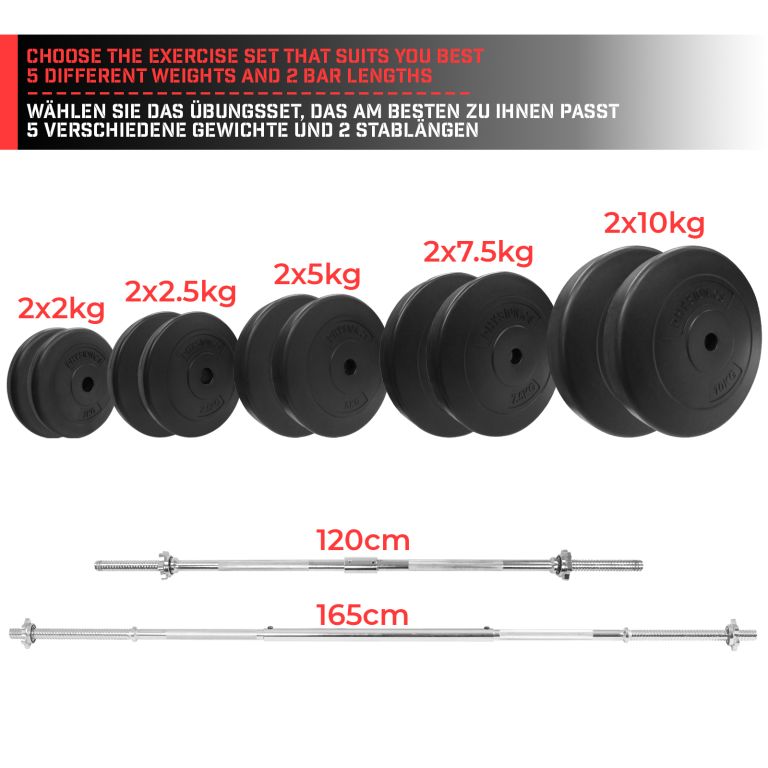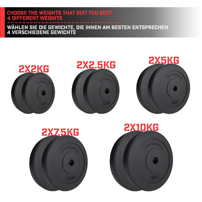 Az otthoni edzés szabadságot ad, hogy akkor edzhessen, amikor és ahogy akar. Ezzel a 2 súlyzókészlettel addig edzhet, amíg el nem éri saját fitneszcéljait. A lemezek műanyag felülettel vannak ellátva, amely gyengéd a padlóhoz. Vegye figyelembe egyéni igényeit és képességeit, és ennek megfelelően alakítsa át edzését. Mi az oka az edzésnek? Jó érzés? Szeretnél szebb alakod lenni? Több izmot szeretnél gyarapítani vagy fogyni? Állítsa össze saját fitness edzését, és mi mindennel felszereljük, amire szüksége van. A menüben megtalálja a megfelelő rudakat és egyéb kiegészítőket, amelyeket ezekhez a lemezekhez illeszthet.