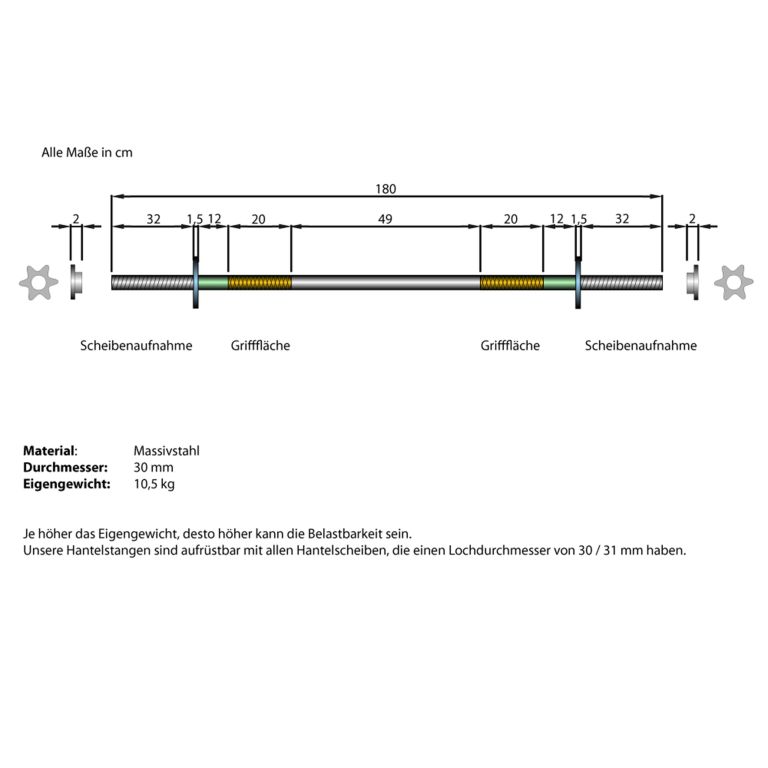 A robusztus konstrukció biztonságot és hosszú élettartamot garantál. A súlyzó átmérője 30 mm, hossza 180 cm, ami széles körű gyakorlatok elvégzését teszi lehetővé. Két csillag alakú záróelem tartja a súlyokat a helyükön. A maximális teherbírás 150 kg, ami alkalmas a legtöbb otthoni és haladó edzéshez.
